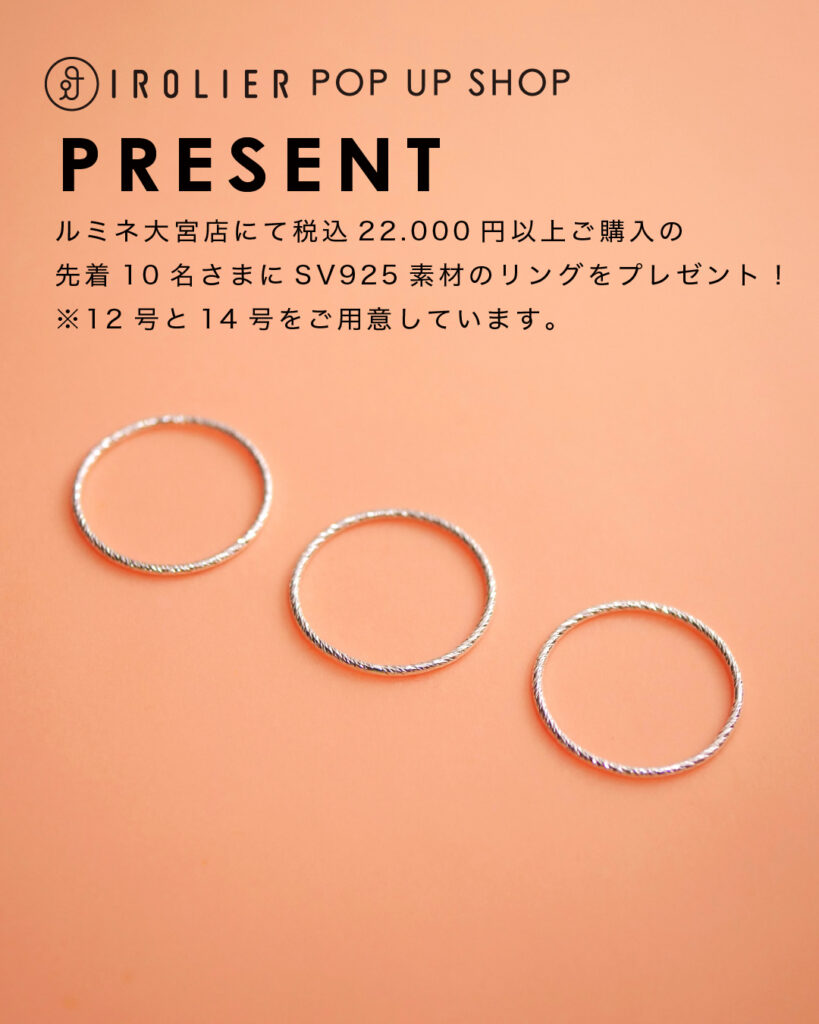ルミネ大宮店POP UP SHOPではイロリエール商品22.000円以上ご購入の先着10名さまにSV925素材のリングを1本プレゼント。